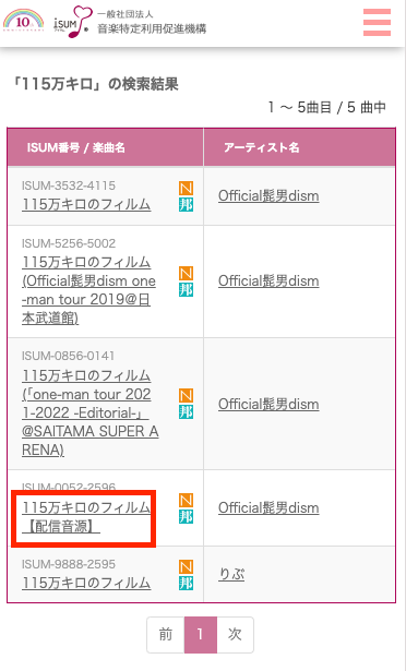 1. 下記URLからISUMのデータベースにアクセスし、曲名を検索